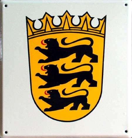 Amtsschild in Facetteform, mehrfarbig bedruckt mit dem kleinen Landeswappen von Baden Württemberg.