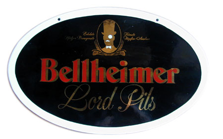 Bei diesem Email Reklameschild aus dem Bereich Foto – Werbung wurde das orangefarbene und dunkelblaue Email schabloniert, die Bilder wurden im Rastersiebdruck auf das Emailschild gedruckt.