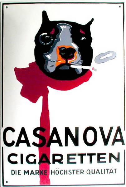 Bei diesem gewölbten Emailschild für Zigaretten wurde die großflächige Werbung schabloniert, die kleinen Farbflächen wurden im Direktdruck gefertigt.