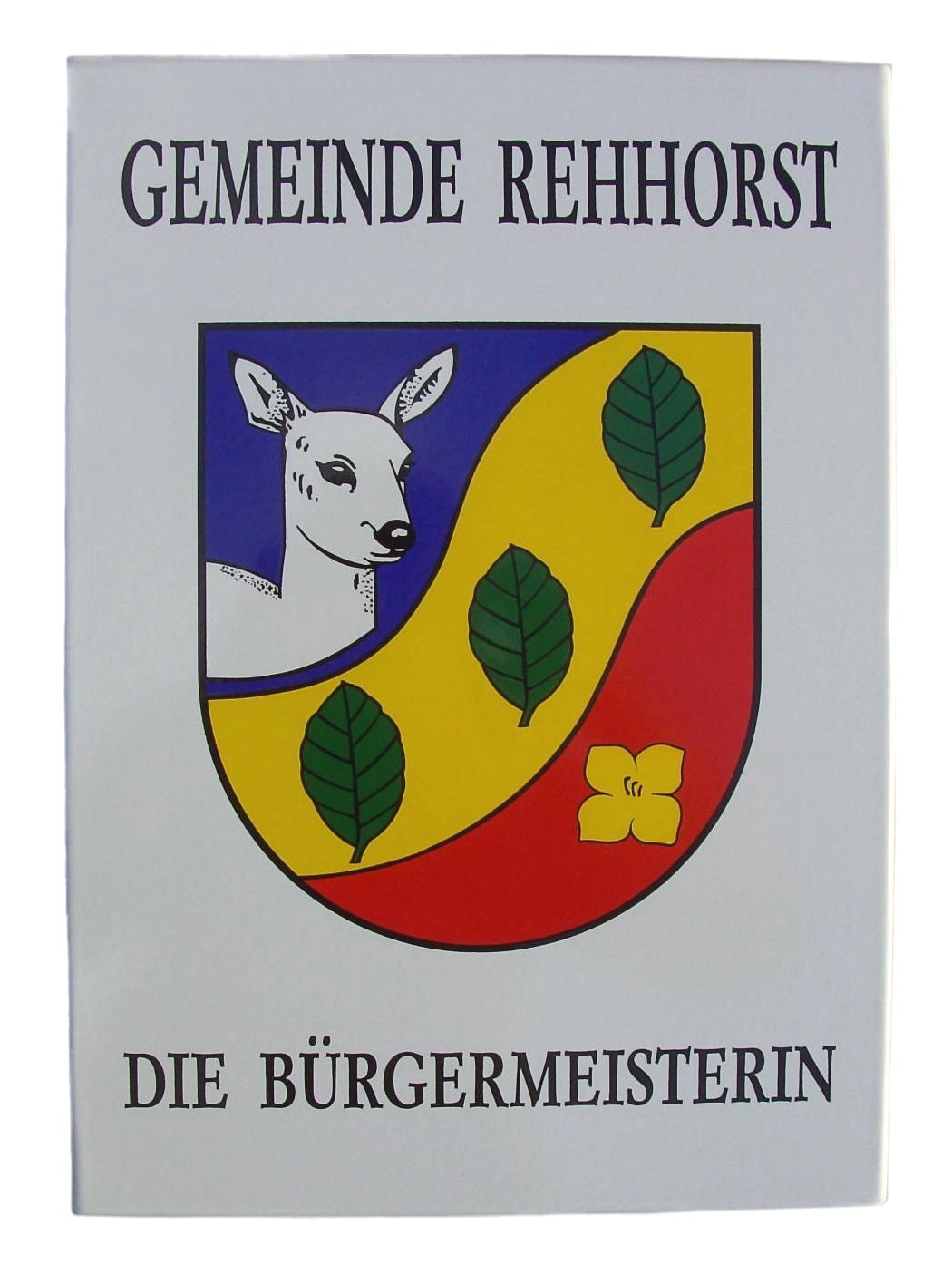 Das Gemeindeschild mit Gemeindewappen und der Textzeile ist ein Blickfang für das Haus der Gemeinde-Verwaltung. Das Gemeindeschild wurde umgekantet. Die Löcher sind in der Umkantung eingebracht, so dass es auf eine Rückseitenplatte montiert werden kann. Dadurch stören keine Schrauben die Ansicht der Vorderseite.