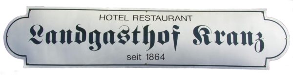 Startseite / Emailschilder / Schilder für Firma & Praxis / Firmenschilder / Emailliertes Firmenschild für ein Gasthaus Emailliertes Firmenschild für ein Gasthaus Dieses Email-Firmenschild ist 230 cm groß. Es wurde in Handarbeit in seine gewölbte und ausgeschnittene Form gebracht. Es ist ein Beispiel für ein besonderes Firmenschild aus Emaille für ein Gasthaus. Kontakt & Anfrage Ähnliche Produkte Straßenschild aus Email Dieses emaillierte Straßenschild in flacher Form wurde mit altdeutscher Schriftart hergestellt. Wappenschild aus Email-Partnerschaftswappen Wappenschilder aus Email zu Städtepartnerschaften werden von uns ebenfalls hergestellt. Hier ein Beispiel für ein ovales Wappenschild, in gewölbter Form mit den Wappen der Partnerstädte. Straßenschild aus Email Dieses Straßenschild aus Email wurde in gewölbter Form mit Blockschrift hergestellt. Amtsschild aus Email mit Landeswappen Amtsschild in Facetteform, mehrfarbig bedruckt mit dem kleinen Landeswappen von Baden Württemberg.