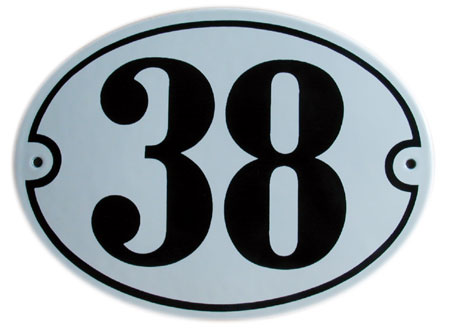 Ein Hausnummernschild aus Email in ovaler Ausführung. Dieses Schild kann ebenso mit dem Straßennamen hergestellt werden. Es gibt verschiedene Standardgrößen.